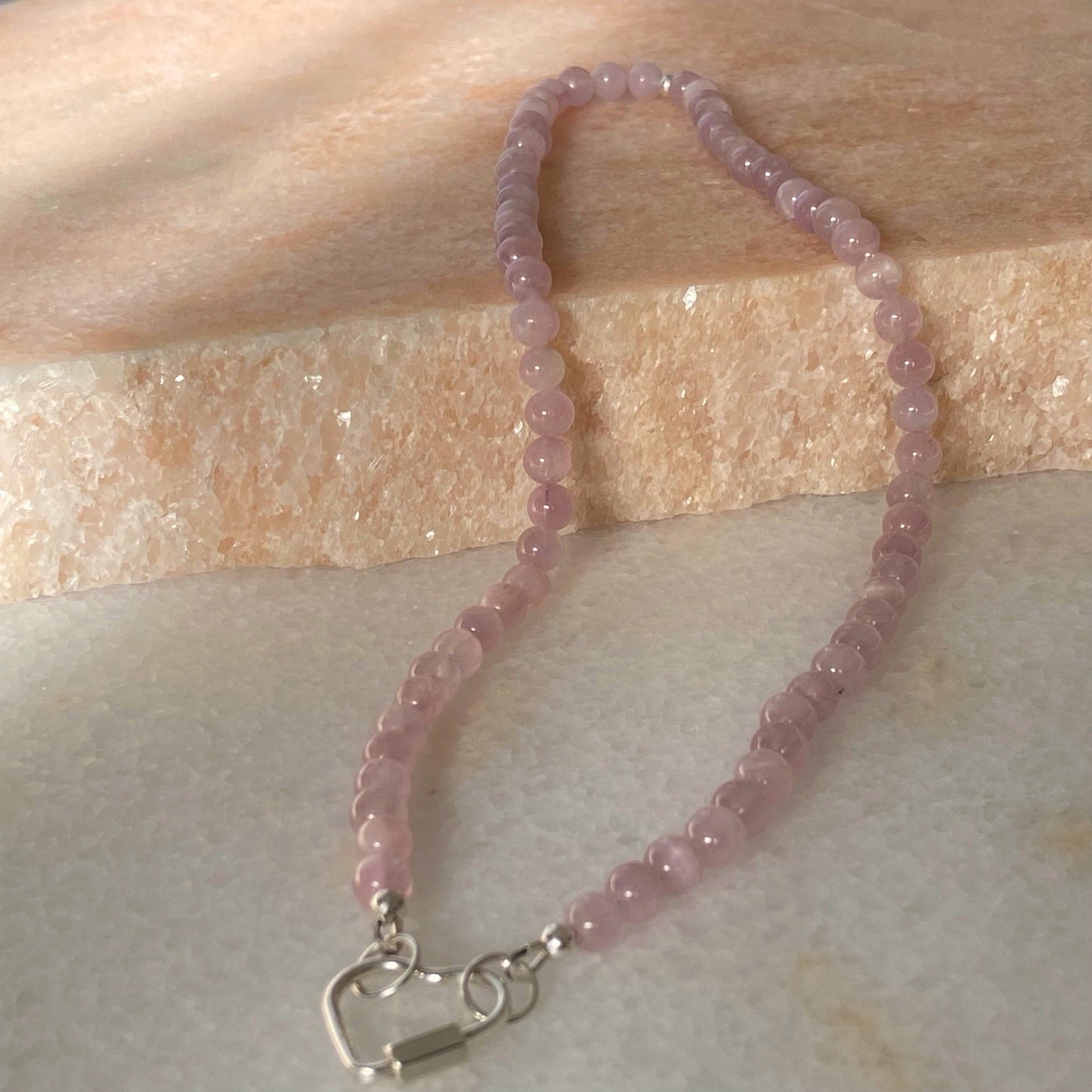 Este hermoso collar de kunzita tiene un mosquetón en forma de corazón que le agrega fuerza y estilo a tu look diario. Se dice que el suave tono rosa de la kunzita promueve el amor y la compasión, lo que hace que este collar no solo esté de moda sino que también sea beneficioso para el corazón. Mejora tu colección de joyas con esta pieza única.