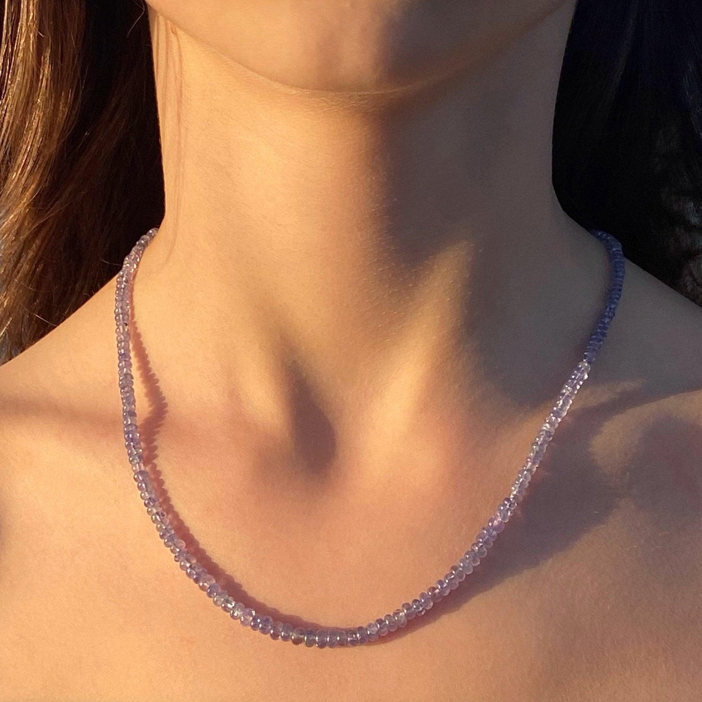 Impresionante collar de tanzanita, que incluye una delicada tira de brillantes cuentas de tanzanita de color azul violáceo y cuentas bañadas en oro. Realza cualquier atuendo y añade un toque de elegancia con esta pieza atemporal.